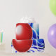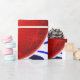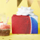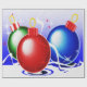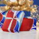 Esta imagem retrata bolas de Natal em vermelho, azul e verde. As fitas e as estrelas são vistas em branco, azul e vermelho. Foi adicionado um plano de fundo azul. Uma falha foi adicionada a este design. Este papel de embalagem de Natal está disponível em estilos e tamanhos variados.