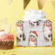 Uma ilustração aquosa adorável de um Pastor australiano senta-se com um fundo de arte "woof" divertido numa cinza macia e pálida. O cachorro é um tricolor e veste um chapéu vermelho de Papai Noel com um cachecol vermelho e branco listrado no inverno.