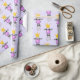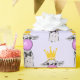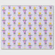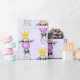 Esfregando papel com um padrão charmoso e engraçado. Projetado com uma lama branca soprando uma grande bolha rosa enquanto mascava goma. Vestindo uma coroa dourada e uma gravata arco preta. Fundo roxo claro.