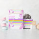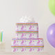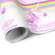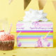 As meninas irrisórios do arco-íris da arte do unicórnio personalizaram o papel de envolvimento do chá de fraldas. Personalize com seu próprio nome e a mensagem, lê atualmente parabéns Tracey em seu bebê novo. Pintura original da arte da aguarela e design gráfico por Sarah Trett. www.sarahtrett.com para www.mylittleeden.com