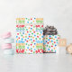 Texto de Natal divertido e pontos brilhantes embrulhando papel de presente em branco, azul, vermelho, verde e amarelo. Projetado por www.mylittleeden.com