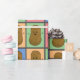 Estilo de pop-arte colorida divertido envolvendo papel com um padrão de retângulos coloridos diferentes cada um com uma batata marrom feliz no meio.