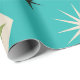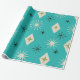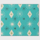 Adicione estilo da era atômica ao seu papel de embrulho com estas folhas de papel de embrulho elegantes com estrelas atômicas modernas de meados do século com pequenos diamantes em bege, preto e verde abacate em fundo azul turquesa