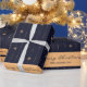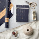 Papel de empacotamento com fundo de wallpaper azul escuro e listrado dourado com um script elegante e fonte serif na qual sua informação personalizada é escrita. Veja na nossa loja mais itens desta coleção.