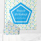 Parabéns com estrelas azuis, amarelas e verdes. Personalizável para qualquer idade.
