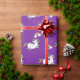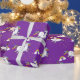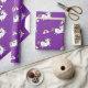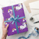 Um belo e fantástico papel de embrulho com um padrão de adoráveis unicórnios brancos tubérculos saltando através de um céu roxo. Eles têm caudas coloridas do arco-íris e manes e chifres do arco-íris, e estão cercados por arco-íris, nuvens e estrelas douradas. Um presente ideal para crianças.