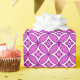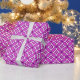 Papel de enrolamento num tradicional Shippo japonês, ou "sete tesouros", com um padrão de entrelaçamento de círculos com uma flor central - flores em ameixa profunda com uma orquídea leve e profunda, fundo roxo profundo e fundo branco com padrão