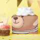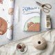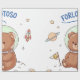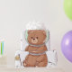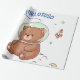 Um adorável astronauta ursinho de pelúcia sentado felizmente num planeta minúsculo, sonhando entre estrelas e foguetes.