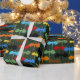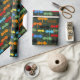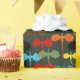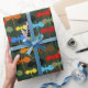 Um grupo asa de dragões nas cores de preto, marrom, vermelho, laranja, amarelo, azul e verde abre asas através de um fundo verde escuro profundo que sobe para cima. Os dragões são desenhados num estilo de tatuagem tribal.