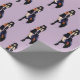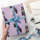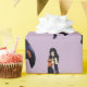 Preto cabelado com tudo a preto em laranja num pano de fundo roxo, a bruxa está a segurar um chapéu de disquete grande.