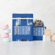 White Happy Birthday texto sobre fundo azul com balões pretos, confete, faíscas e vela. A cor de fundo pode ser alterada.