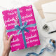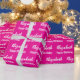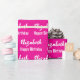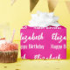 A embalagem de aniversário é rosa quente. Ele tem um padrão de texto para o nome do destinatário em um script e a frase Parabéns. O nome (Mostra: Elizabeth) aparece em um roteiro elegante. O texto é branco. Todo o texto pode ser editado.