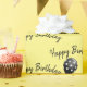 Feliz texto de aniversário com balões de bolinhas preto e branco sobre fundo amarelo. O texto pode ser editado. A cor de fundo pode ser alterada.