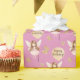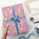 Bonito padrão de uma fada segurando um balão com borboletas. Texto "Parabéns" mostrado em letras pretas. Design está sobre um fundo rosa. Este papel de embrulho de presente irá certamente tornar muito especial a apresentação de presente de qualquer criança.
