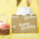 Um papel brilhante de ouro com Feliz Aniversário escrito nele.