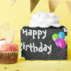 Buquê de balão colorido sobre fundo brilhante com texto de aniversário feliz.