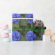 Feliz Natal está escrito em roteiro verde. Bonito flores azuis de hydrangea e folhas verdes grandes. Fotografia original © TamiraZDesign.