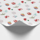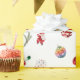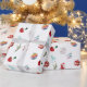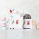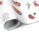 O papel de embrulho apresenta um tema de feriado simples e elegante. Um galho fino adornado com vários ornamentos pendurados, incluindo uma rena, uma bola colorida do arco-íris, bolhas padronizadas, um cogumelo e uma figurina de Papais noeis, acrescenta um toque caprichoso e festivo.
