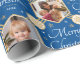 Torne seus presentes de feriados especiais extra com papel personalizado de empacotamento de fotos! Este modelo editável é personalizado com quatro de suas fotos favoritas, e o nome do destinatário, seu nome de família ou o ano de feriado. Apresenta quadros de imagem hexagonais, colocados sobre um fundo festivo de flocos de neve e estrelas, juntamente com a frase "Feliz Natal". Um design de na moda emparelhando a tipografia tradicional com um design geométrico clássico. Perfeito para fotos de crianças, família, amigos e animais de estimação! Este pacote de presentes de padrão uniforme está disponível com um acabamento mate ou brilhante. Cores impressas: azul, branco e uma cor dourada.