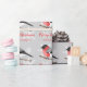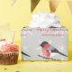 A ilustração original de um desenho animado Eurasiano Bullfinch, um passarinho bonitinho, sentado num galho de árvore marrom que tem neve nele. O pássaro tem uma cabeça preta e um peito vermelho. A cor de fundo é cinza com algumas formas brancas de floco de neve. Sob o pássaro, lê-se "Feliz Natal" em lindas fontes vermelhas e há também uma área de texto personalizável de quem o presente é, por exemplo.