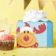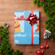 O presente de Natal moderno é embrulhado para crianças, com Rudolph a Reindeer, a saudação de "Feliz Natal" na tipografia da na moda, e um nome personalizado. Sobre um fundo azul com flocos de neve.