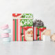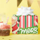 Um Papai Noel alegre, com a Sra. Claus desejando-lhe um sorteio de Feliz Natal sobre um tradicional fundo vermelho, verde e branco listrado.