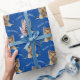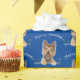 Cute Yorkshire terrier em tonalidades prateadas e luzes de férias em um fundo azul com texto Feliz Natal. A cor de fundo pode ser alterada.