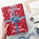 Texto branco de Natal feliz em um padrão de floco de neve em vermelho com fundo branco de bolinhas. O texto pode ser editado.