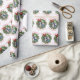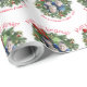 Este papel de embrulho divertido torna seus presentes de férias ainda mais especiais. O design bonitinho permite que você carregue sua foto no centro de uma coroa verde com galhos de pínus, um arco vermelho, sinos, estrelas e holly. O texto diz "Feliz Natal", em caracteres brancos, com um lugar para digitar um nome e um ano.