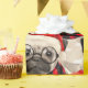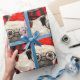 Um Pug em óculos, Papais noeis, boné e cachecol de inverno com faixas adoráveis é modelado neste papel de presente de feriado divertido para amantes de estimação.
