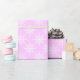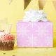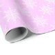 Este papel de embrulho apresenta um padrão de flocos de neve brancos sobre um fundo cor-de-rosa macio e pastel.