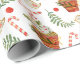 Este papel de embrulho de férias apresenta um padrão de doces de Natal rodeados por pássaros bonitinhos, pererecas verdes e canas doces de menta em fundo branco.