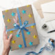 Um papel festivo de embrulho para a época de Natal, com estrelas azul-turquesa e douradas sobre fundo de papel kraft rústico. Excelente para qualquer ocasião e faz um embrulho de presente impressionante.
