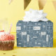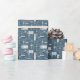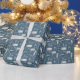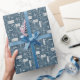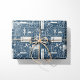 Enrole seus presentes em estilo com este charmoso presente de feriado. Apresentando um elegante padrão de caixas de presente ilustradas, meias e sotaques de feriado em um esquema de cores azul e branco contemporâneo, este papel de embrulho traz um toque sofisticado, mas festivo, a qualquer presente.