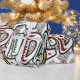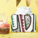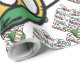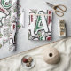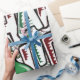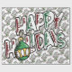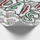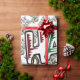 Esta imagem é uma mensagem que diz "Feriados Felizes" em cores branca, vermelha e verde. Um ornamento único de bola de Natal em verde, branco e ouro está pendurado. A mesma imagem é colocada como um plano de fundo. Este papel de embrulho vem em uma variedade de estilos, cores e tamanhos.