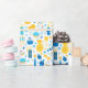 Adicione alguma cor de feriado e brilho com este divertido design de papel de embrulho Chanukah. Adequado para crianças ou adultos, necessidades de plástico corporativo ou familiar. Há sacos de presentes coordenados, papel de tecido e fita para uma aparência completa de Chanukah, ou você pode misturar e combinar com nossos outros padrões de papel embrulhado de Chanukah. Este design está em azul, branco e ouro com presentes Chanukah, menorahs, streams e muito mais.