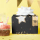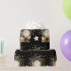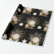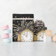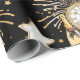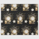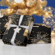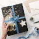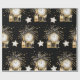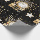 Véspera de Ano Novo ou presente de festa de Dia do ano novo embrulhado com ouro a preto, com um relógio pronto para greve à meia-noite, champanhe e presente. Ofereça aos seus convidados do partido ou a sua outra significativa com algo especial para celebrar o próximo ano. Dourado, preto, brilho dourado.