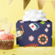 Aproveite uma festa de cassino com tema de boa sorte com este padrão e design de Festa de Cassino. Todos os ícones de jogos de azar, como fichas de pôquer, cartas, dados e máquinas caça-níqueis, além de mais elementos em um fundo azul-marinho.