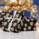 Give your gifts a touch of fluffy elegance! This adorable wrapping paper features realistic orange and white Pomeranians wearing large, festive green and red geometric bow ties. The background is a sleek black, dusted with golden yellow sparkles and stars.
