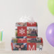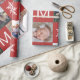 Flocos de neve brancos e festivos em um papel de Natal de fundo vermelho embrulhando papel com colagem fotográfica e monograma.