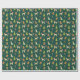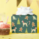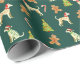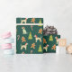 um papel de embrulho com tema de Natal com um padrão repetitivo. O padrão consiste em vários elementos, incluindo chicotes vestindo chapéus vermelhos de Papai Noel e lenços vermelhos, árvores verdes de Natal decoradas com ornamentos vermelhos, gengibres e doces. A cor de fundo do papel de embalagem é verde-escuro, o que contrasta bem com os elementos coloridos. O design é festivo e caprichoso, fazer adequado para embrulhar presentes de Natal, especialmente para amantes de cães ou para aqueles que apreciam um tema de feriado lúdico.