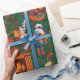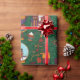 Gifts and Decor: Interspersed are classic Christmas elements like wrapped gifts, stars, Christmas trees, and mugs of cocoa, all rendered in a bold, rich color palette.