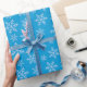 "Blue Snowflakes apresenta um papel de enrolamento sem costura" apresenta um padrão delicado de flocos de neve, trazendo a beleza de um dia de inverno nevado para o seu embrulho de presente de Natal.