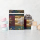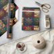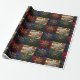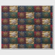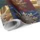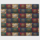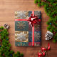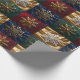 Papel de enrolamento com flocos de neve dourados em imagens verdes, azuis e vermelhas de veludo com um floco de neve branco em uma imagem de veludo dourado. Juntos, eles são repetidos em um papel de embalagem de cor rica.