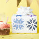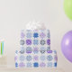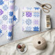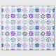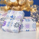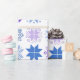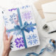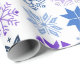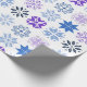 Este papel de embrulho tem um design de inverno com diferentes flocos de neve em blues e roxas em filas.