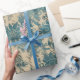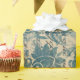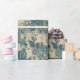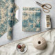 Estêncil azul/verde projetou flores sobre um fundo de escrevendo cursivo e abelhas. O fundo é um bronzeado leve. Perfeito para desacoplamento, artesanatos ou embrulhamento de presente. Por favor, verifique o modo de exibição de "costura" para garantir que ele seja aceitável.