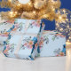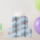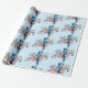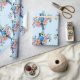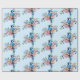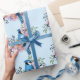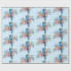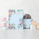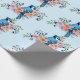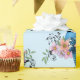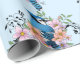 Um pássaro azul rodeado por flores de primavera cor rosa, púrpura e pêssego colorido colorido contra um pano de fundo azul claro.