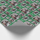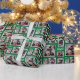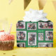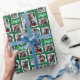 Use 5 das suas melhores fotos de família para fazer seu próprio papel de embrulho personalizado. Este presente verde, branco e preto tem alguns simples flocos de neve e a palavra alegre adicionada para elogiar o design.