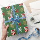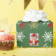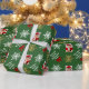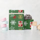 Design de papel embrulhado festivo personalizado para Natal com flocos de neve dourados e brancos de inverno e arco de fita vermelha em um fundo verde profundo personalizável, personalize este design, adicionando seu nome de família ou texto Xmas saudando e adicionando sua foto favorita da família.