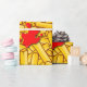 Um desenho animado hilariante que embrulhava papel com batatas fritas espalhadas com ketchup vermelho.
